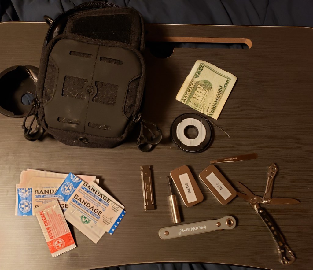 The image below is my general EDC (Everyday Carry)L as noted I have some meds and bits in a tin for my mini ratchet. Some just in case money, bandages, cleaning wipes, anti sting wipe, burn cream, nail clippers, small pocket knife/scissors, tweezers the donut thing is high strength string
